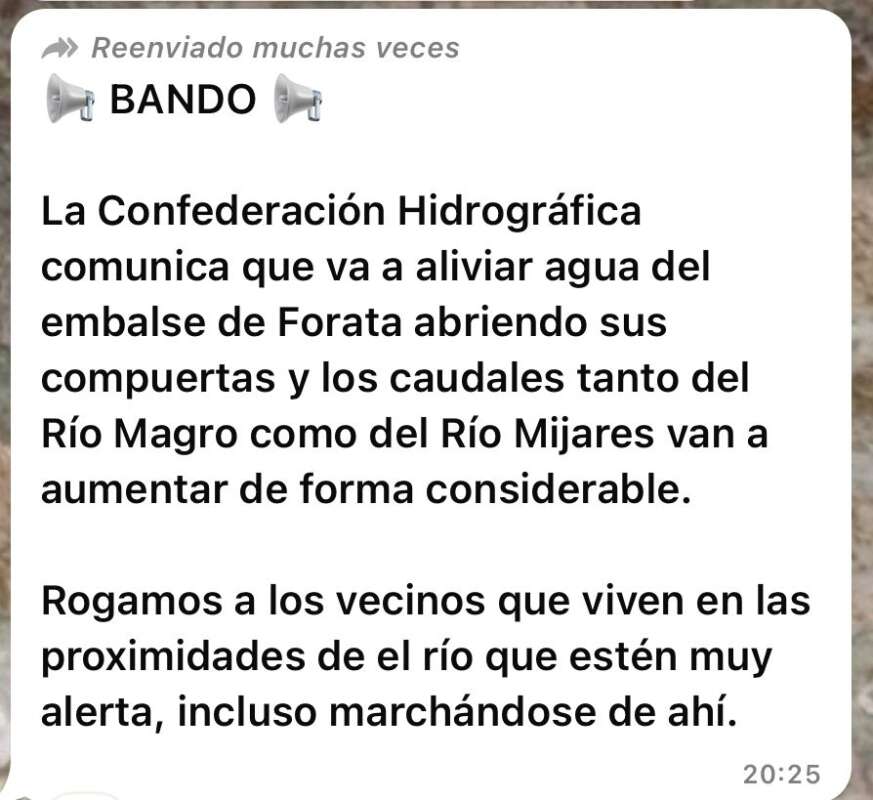 La credida de los ríos y las presas ha llevado a la Confederación Hidrográfica del Júcar a abrir las compuertas para aliviar algunos de los embalses y a emitir un bando para prevenir a los vecinos de los municipios que puedan resultar afectados al paso del Río Magro y del Río Mijares.