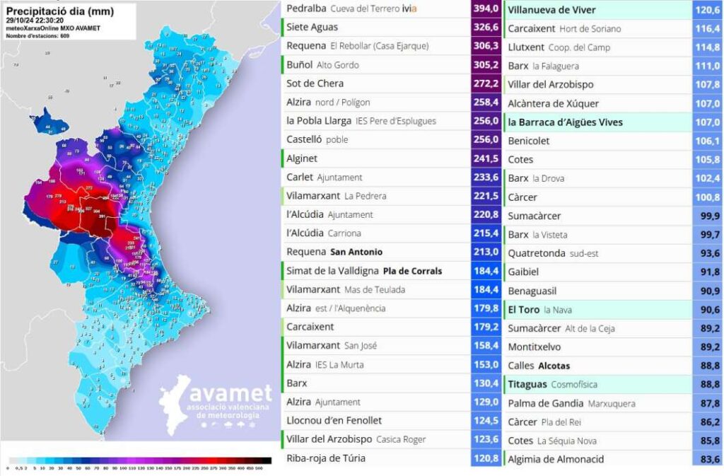 Tal como ha informado À Punt, "las primeras horas de las fuertes tormentas se han centrado en la Safor y la Ribera. Han avanzado de sudeste en el oeste y han sido acompañadas de temporal en el mar, con oleadas de hasta tres y cuatro metros. Las peores previsiones se han cumplido y, según datos de la Agencia Valenciana de Meteorología (Avamet), en localidades como Pedralba, Siete Aguas, Requena y Buñol se han superado los 300 l/m² desde el inicio del día".
