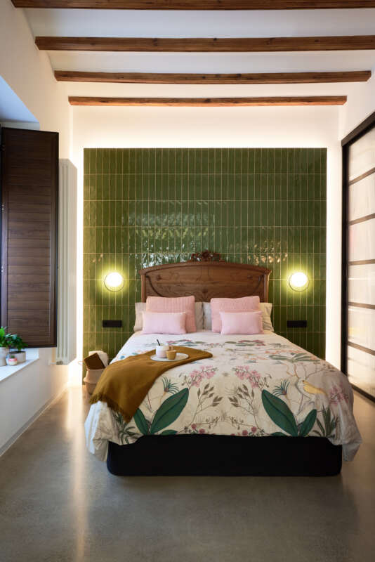 El dormitorio principal incorpora una cómoda y un cabezal modernistas que se enmarca sobre un volumen retroiluminado revestido con cerámica tradicional verde oliva de Decocer de pequeña escala. También en los baños, los espacios intermedios y en la pared de un patio exterior elevado, se utiliza cerámica de formato pequeño de la misma firma. Son piezas con un marcado vidriado inspirado en la cerámica tradicional y de siempre.