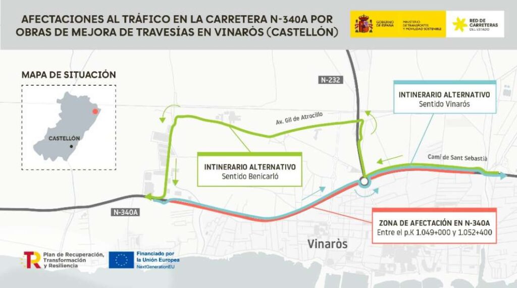 El Ministerio de Transportes y Movilidad Sostenible está ejecutando los trabajos de adecuación al paso de bicis y peatones de las carreteras N-340A, N-232 y N-238 en Vinaròs. Las obras cuentan con un presupuesto de 6,7 millones de euros (IVA incluido) y están financiadas por los fondos Next Generation del Plan de Recuperación, Transformación y Resiliencia (PRTR).