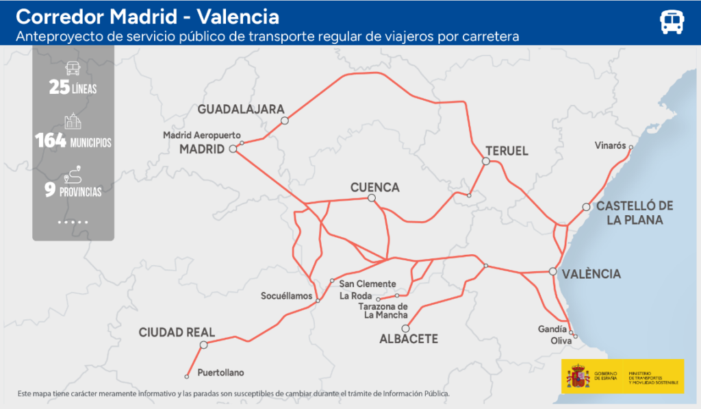 El Ministerio de Transportes y Movilidad Sostenible ha abierto al trámite de información pública el anteproyecto para el establecimiento del servicio público de transporte regular de viajeros por carretera entre Madrid y Valencia, con el fin de cubrir todas las paradas que se encuentran actualmente en servicio. El anuncio se ha publicado ya en el Boletín Oficial del Estado.