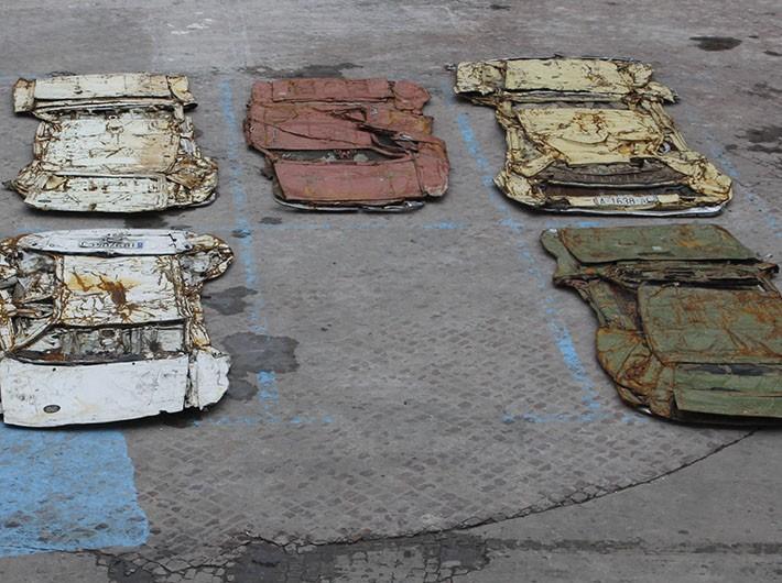 El hueso, el sustento, está representado por grandes muros de hierro compuestos por vigas de construcción cortadas y moduladas a modo de ladrillos, generando espacios, paredes, celosías, lienzos cerrados y figuras geométricas. La piel la conforman una serie de coches y motos aplastados hasta convertirse en una representación gráfica de ellos mismos. Las pieles implican superficie, dermis; expuestas a la intemperie, a la degradación, a la decadencia. Una inquietante ligereza que gana significación y potencia estética al contrastar con la imponente solidez de los muros y columnas de hierro.