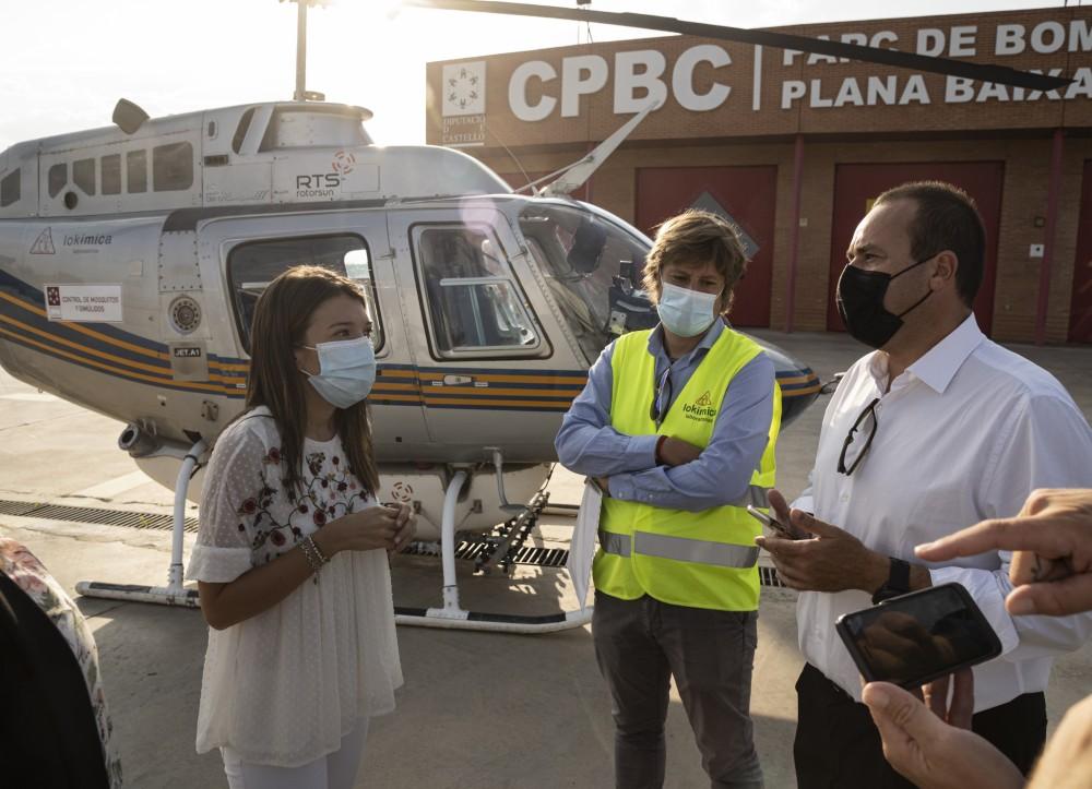La Diputación de Castellón ha iniciado hoy las fumigaciones en las marjales de Almenara, la Llosa, Xilxes, Moncofa, Nules, Oropesa, Torreblanca, Cabanes y Peñíscola para reforzar los tratamientos aéreos en las zonas susceptibles de convertirse en viveros de mosquitos tras los episodios de fuertes lluvias de las últimas semanas. Así lo ha explicado a primera hora de la mañana la diputada de Medio Natural, María Jiménez, momentos antes de que el helicóptero de la empresa concesionaria Lokímica S.A. iniciara desde el Parque de Bomberos de la Plana Baixa en Nules las sesiones de vuelos programadas para las jornadas de hoy y mañana, autorizadas por la Conselleria de Sanidad Universal y Salud Pública. Se va actuar sobre una superficie aproximada de 1.700 hectáreas, siendo la la previsión trabajar durante la jornada de hoy en las poblaciones de la Plana Baixa y mañana en la zona norte, llegando hasta el municipio de Peñíscola.