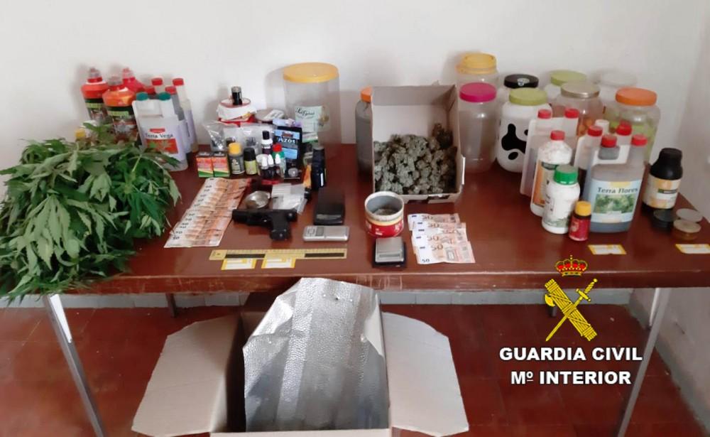 Los guardias civiles tras solicitar el correspondiente mandamiento judicial, accedieron al lugar encontrando un huerto con 10 plantones con un peso de 360 gramos, cogollos con un peso de 167 gramos, numerosos botes de