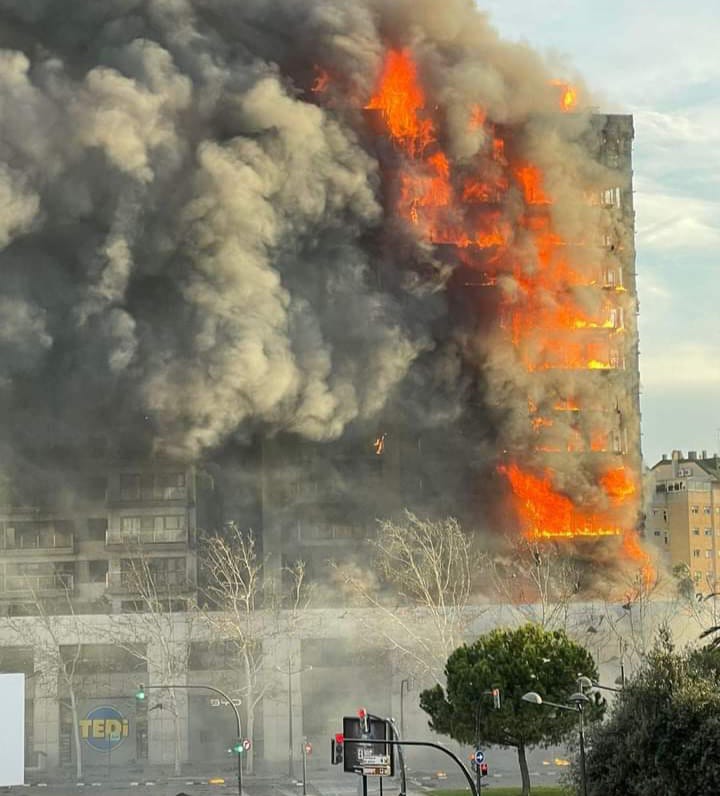 Un edificio de 14 plantas situado en el barrio del Campanar de Valencia era devorado por las llamas en la tarde de este jueves. Las llamas se generaban en uno de los pisos en torno a las 17:30 horas de la tarde y rápidamente se propagaban por todo el inmueble.