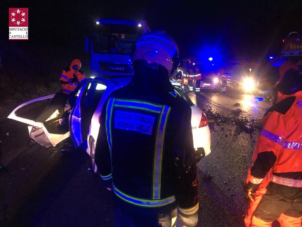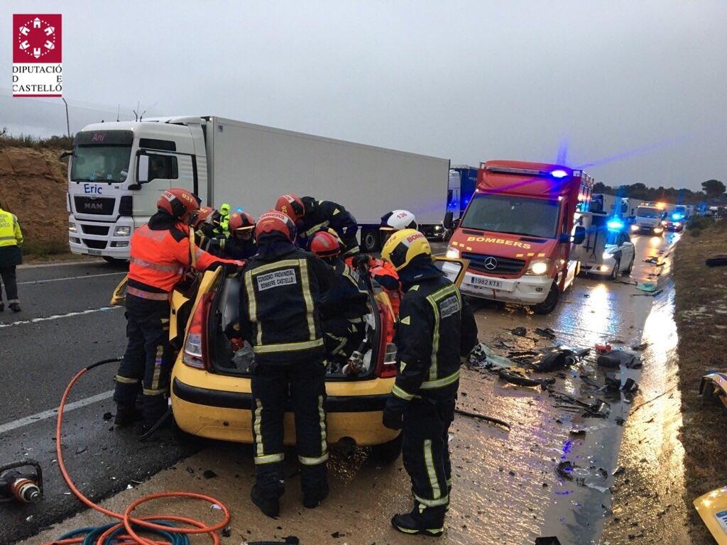 Trágico accidente de tráfico con tres personas fallecidas en esta lluviosa mañana en la provincia de Castellón. El suceso se ha producido sobre las 6:50 horas entre dos coches en la CV-13, en término municipal de Vilanova d'Alcolea a la altura del Aeropuerto de Castellón. Hasta el lugar el Consorcio Provincial de Bomberos ha desplazado dos dotaciones del Parque de Plana Alta. A su llegada, había dos turismos accidentados, con un total de 5 personas atrapadas en su interior, cuatro en uno de los vehículos y la otra en el otro coche. Los efectivos de bomberos han tenido que realizar tareas de excarcelación para conseguir liberar a todas las víctimas.