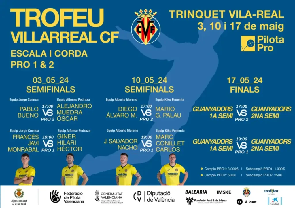 Las semifinales del Trofeu de Pilota Villarreal CF se celebrarán el 3 y 10 de mayo, mientras que las finales se disputarán el viernes 17 de mayo, en plenas fiestas patronales de Vila-real. Las jornadas comenzarán con las partidas de la categoría Pro2, que comenzarán a las 17.30 horas. A continuación, a las 19.00 horas, tendrán lugar las partidas de la categoría Pro1.