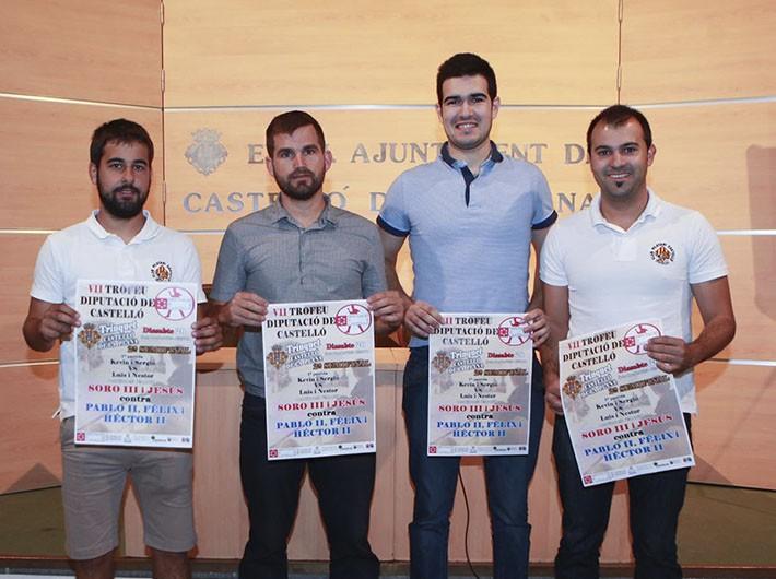 El trinquete municipal de Castelló acoge este sábado la segunda seminifinal del VII Trofeu Diputació que enfrenta a algunos de los mejores pilotaris de la Comunitat Valenciana. La primera partida, en categoría juvenil, enfrenta a Kevin y Sergio a partir de las 17.00 en las instalaciones del complejo deportivo Sindical y, a continuación, jugarán por un puesto en la final Soro III y Jesús (campeones del circuito Bancaja en 2013) contra Pablo II, Félix, uno de los mejores mitjers, y Héctor II, un punter de Massamagrell que también ha logrado algún trofeo Bancaixa. Kevin, en categoría juvenil, y Pablo II son los dos representantes de la provincia en esta segunda semifinal.