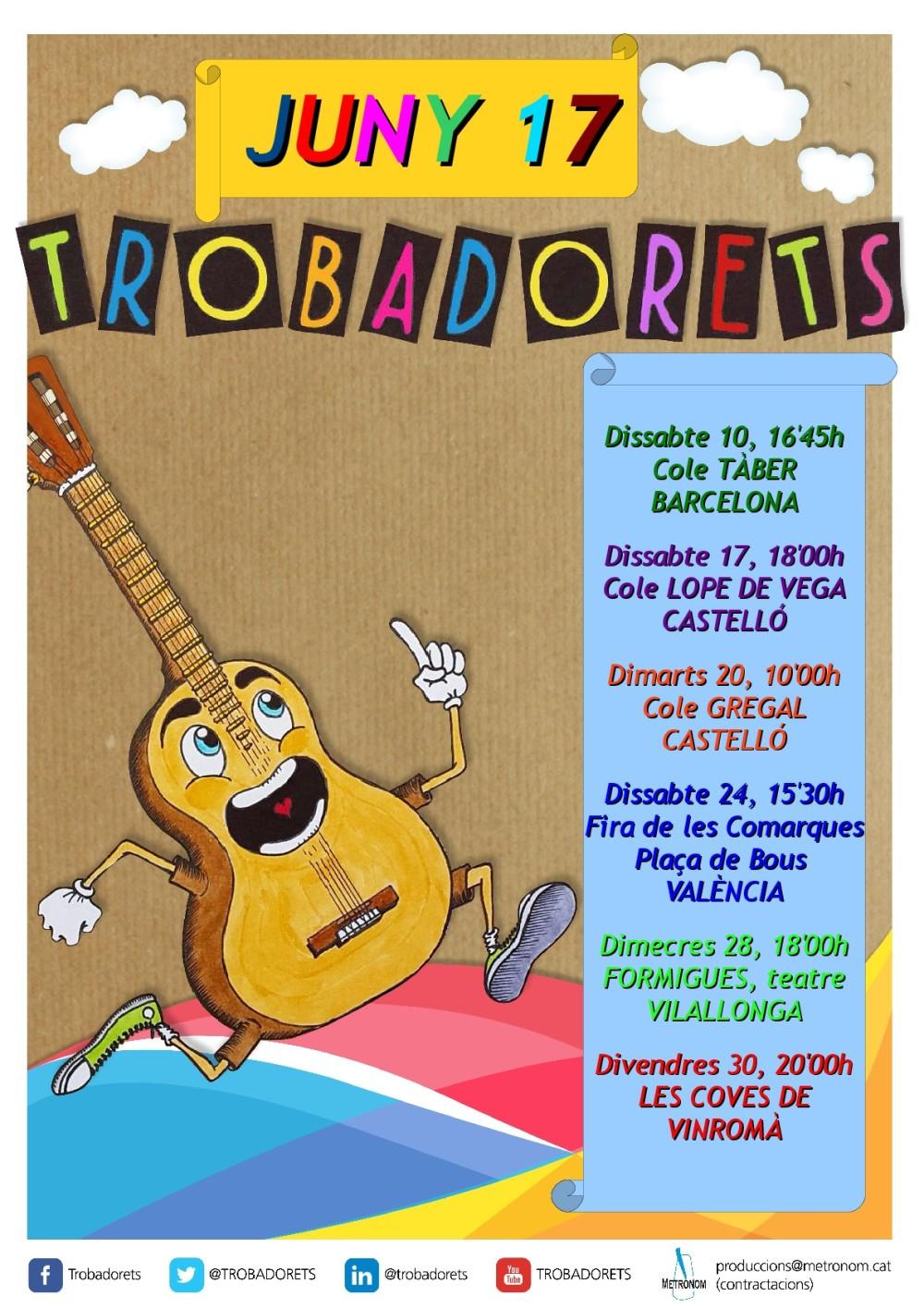 L'agenda de Trobadorets per al mes de juny ve carregada de concerts. Per començar amb força el dissabte dia 10 aplegaran fins a Barcelona, que ja feia temps que no la visitàven i tocaran en el Cole Tàber a les 16.45h. Al dissabte següent, dia 17 a les 18.00h.,  acompanyaran a les amigues i amics del Cole Lope de Castelló en la seua festa de Fi de Curs.