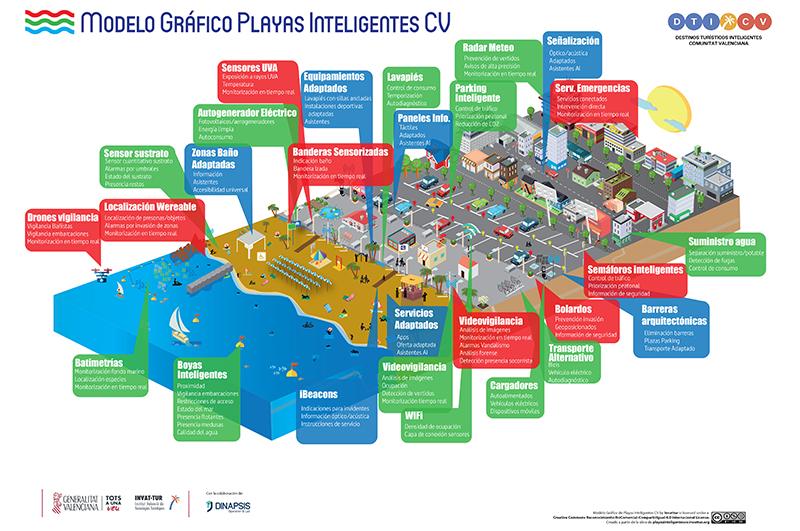 Cabe recordar que este ámbito de trabajo se desarrolla en paralelo al modelo de playas inteligentes, que ya se está implantando en tres destinos piloto (Benicàssim, Gandía y Benidorm), gracias a tecnología aplicada a su gestión, haciendo hincapié en el usuario final. Este proyecto se lleva a cabo a través de tres dimensiones principales: sostenibilidad, seguridad y accesibilidad.
