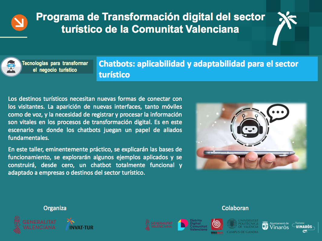 El piloto, desarrollado en el marco de la Red de Destinos Turísticos Inteligentes de la Comunitat Valenciana (DTI-CV), un proyecto puesto en marcha desde el Instituto Valenciano de Tecnologías Turísticas (Invat·tur), trabajará inicialmente en castellano para después poder incorporar su capacidad de respuesta en otros idiomas, tratándose de un chatbot multi-idioma basado en la tecnología propia de la empresa.