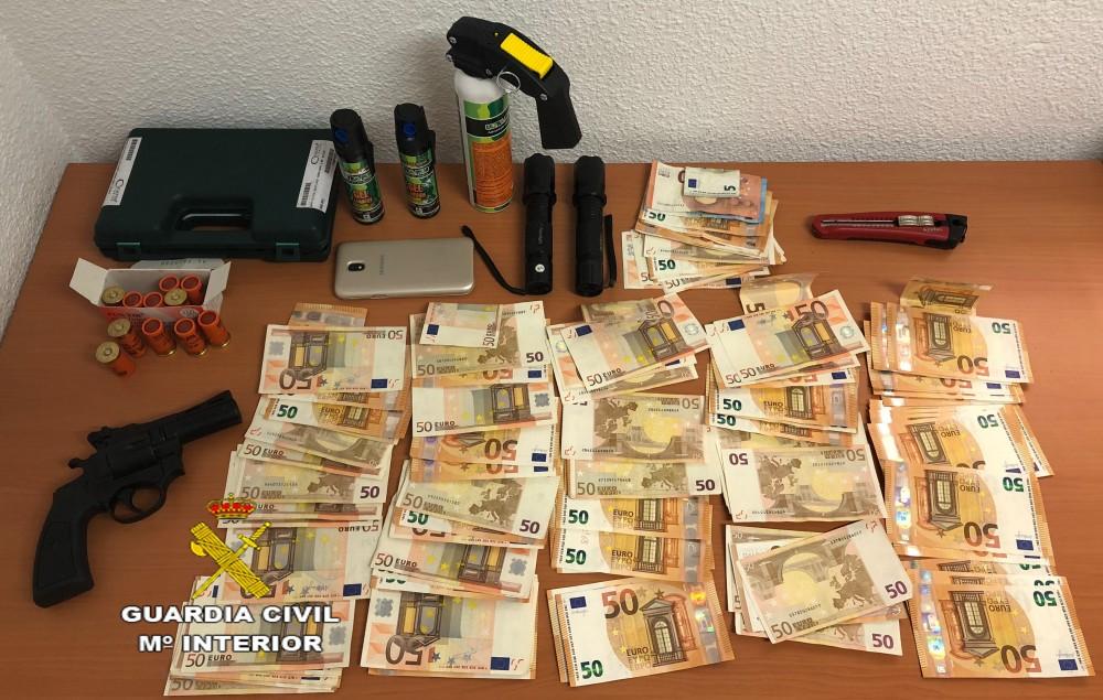 Los guardias civiles inspeccionaron el vehículo interceptado, encontrando en su interior un revolver detonador con once cartuchos, dos taser eléctricos, tres sprays de defensa personal y 5885 euros en billetes fraccionados y monedas.