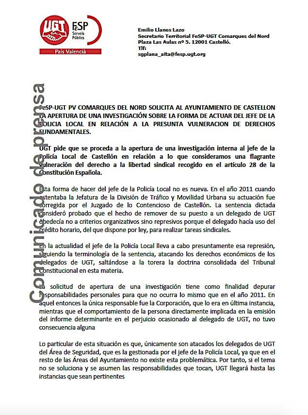 El sindicato Fesp-UGT Comarques del Nord de Castelló, ha remitido un comunicado por el que “solicita al ayuntamiento de Castellón la apertura de una investigación sobre la forma de actuar del jefe de la policía local en relación con la presunta vulneración de derechos fundamentales”.