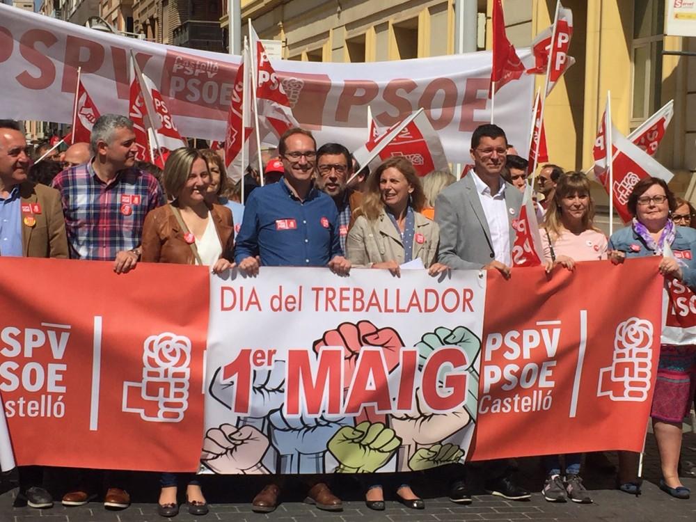Pasadas las 11.30 horas ha comenzado en la calle San Luis de Castellón la manifestación con motivo del 1 de Mayo, Día de los Trabajadores’, convocada por los sindicatos UGT y CCOO, y a la que se han unido formaciones políticas, como el PSPV y Compromís, y colectivos sociales, entre otros las organizaciones que promueven la iniciativa ‘Iglesia por el Trabajo Decente’, además, en gran número, estibadores del puerto que lucían camisetas naranjas con el lema ‘Los Puertos no se venden’.