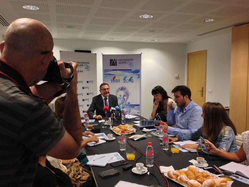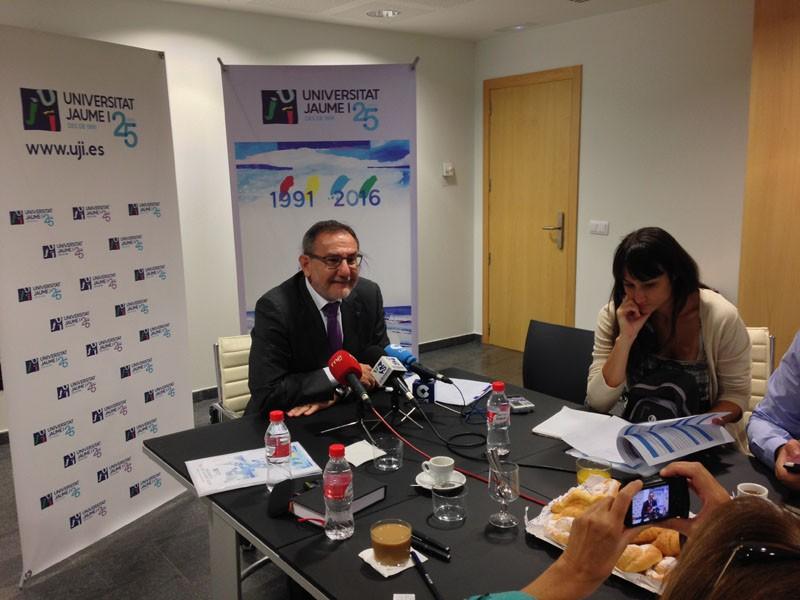 El rector de la UJI, Vicent Climent, ha comparecido ante los medios de comunicación, para hacer un breve desarrollo de lo que han sido estos 25 años, de los objetivos planteados y cómo han evolucionado hasta ahora, y para presentar el calendario de actividades con las que la universidad quiere conmemorar el 25 aniversario de su fundación.