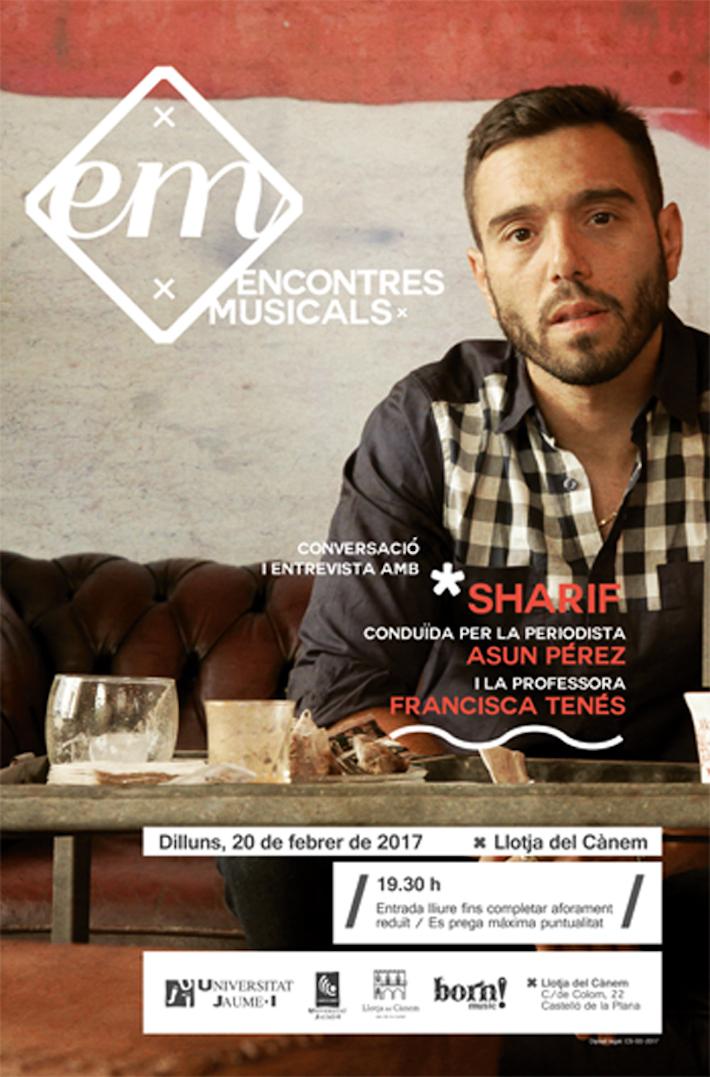 El cicle Encontres Musicals de la Universitat Jaume I comptarà en la seua segona sessió de 2017 amb l'escriptor i raper saragossà Sharif, que mantindrà una conversa oberta al públic amb la periodista musical Asún Pérez de Nomepierdoniuna i la professora de Literatura i Llengua Castellana, Francisca Tenés, per parlar sobre lírica, escriptura i la seua experiència dins del món de l'hip-hop espanyol. La trobada es realitzarà el dilluns 20 de febrer de 2017 a les 19.30 hores a la Llotja del Cànem, Seu de la Ciutat de la universitat pública de Castelló.