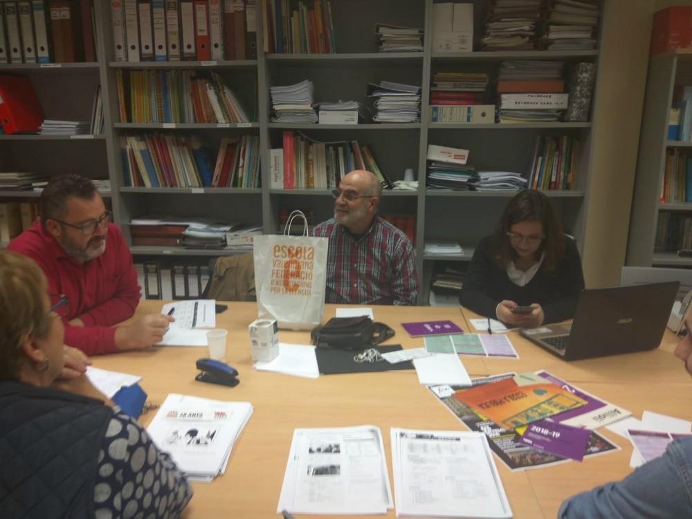 La rectora de la Universitat Jaume I, Eva Alcón, i la vicerectora de Promoció Lingüística i Igualtat, Pilar Safont, s'han reunit amb el president d'Escola Valenciana, Natxo Badenes, i dos representants d'aquesta entitat, Pilar Gregori i Toni Vizcarro.