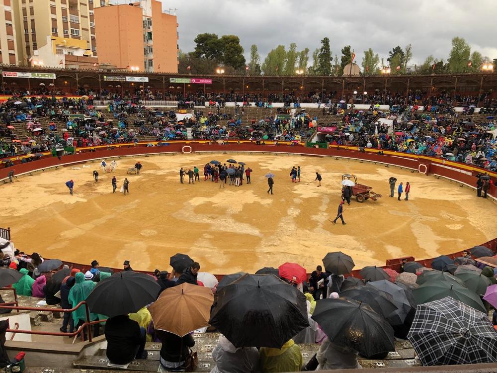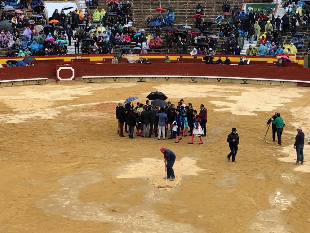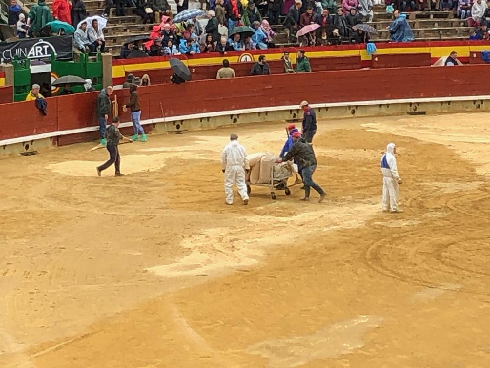 Pero lo peor llegó con la climatología. Tras una mañana entera de lluvia, el ruedo era un barrizal lleno de charcos y seguía lloviendo, con una previsión, además de lo más adversa.