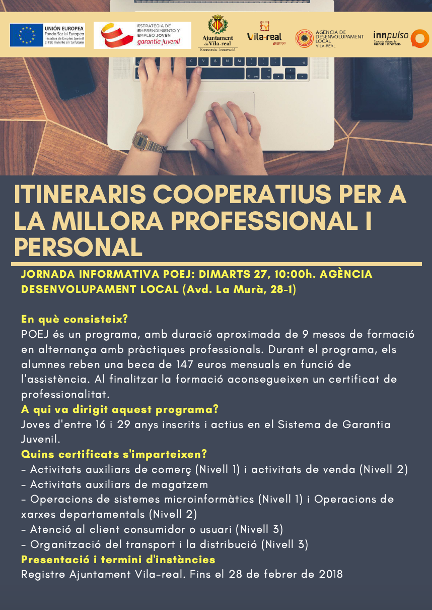 El POEJ és un programa mixt de formació i ocupació, finançat a través del Fons Social Europeu (FSE) i gestionat pel Ministeri de Treball, amb l'objectiu d'oferir a joves d'entre 16 i 30 anys una nova oportunitat per a integrar-se en el mercat laboral. La iniciativa compta amb un pressupost de 446.572 euros i es dirigeix a tres col·lectius: joves sense formació (30 places), amb formació bàsica i mitjana (20) i amb formació superior (10). Els beneficiaris podran inscriure's en cinc itineraris formatius, que donaran lloc, una vegada completat el curs, a certificats de professionalitat en tres àrees: serveis a les empreses (certificat d'Activitats auxiliars de comerç, Activitats de venda i Atenció al client), noves tecnologies (certificat d'Operacions auxiliars de muntatge i manteniment de sistemes microinformàtics i Operacions de xarxes departamentals) i àrea de logística i distribució (Activitats auxiliars de magatzem i Organització del transport i la distribució).