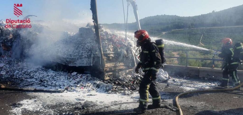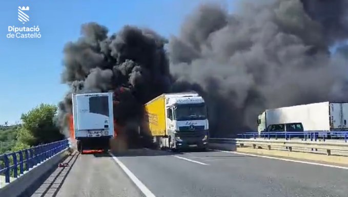 Nuevo incendio en la provincia de Castellón, aunque esta vez en la carretera. Un camión se ha visto envuelto en llamas la tarde de este viernes cuando circulaba por la autopista AP-7, en el término municipal de Alcalà de Xivert. Los hechos se han producido en torno a las 18:00h de la tarde.