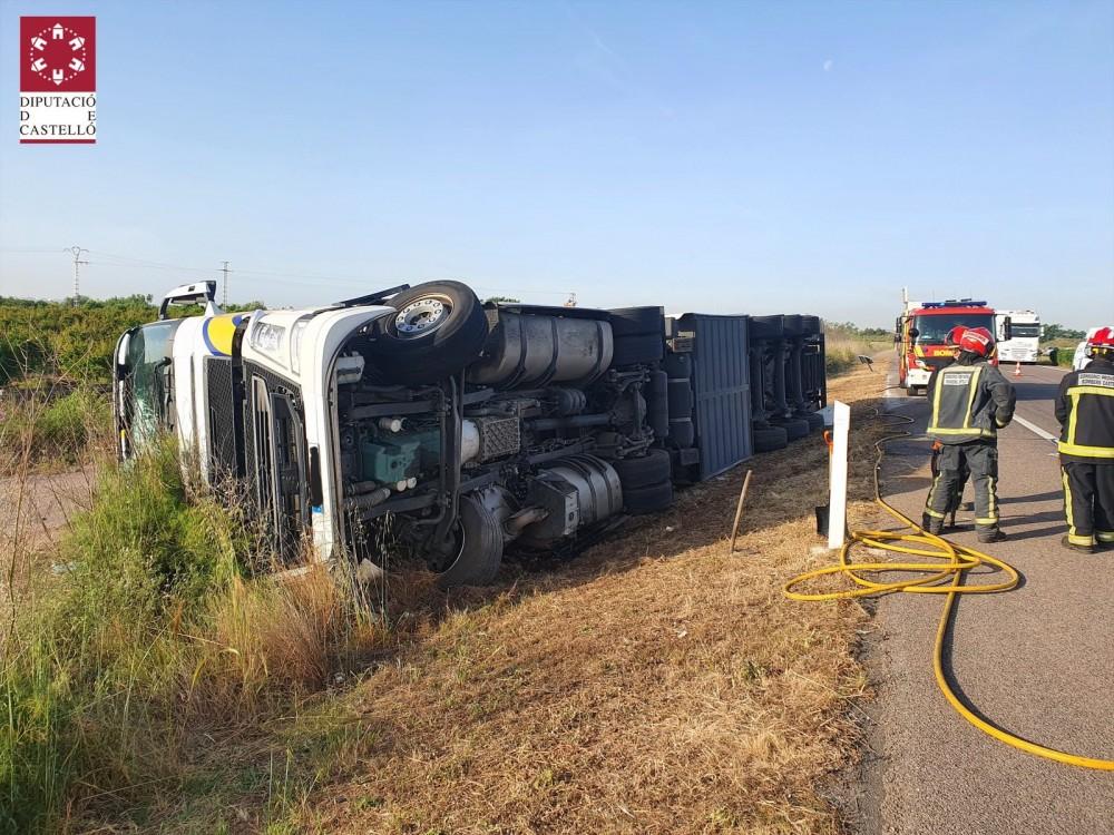 Los Bomberos de Castellón, del Consorcio de la Plana Baixa, han trabajado en contener fuga del depósito de gasoil del camión accidentado.
