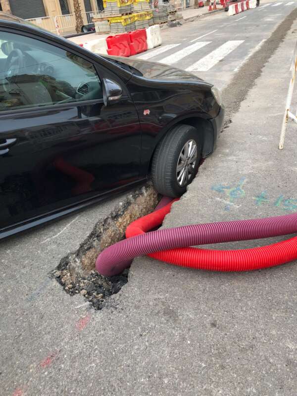 La foto que hoy se pasaban los vecinos de la avenida de Lidón, de Castelló, es una consecuencia más de las obras que se realizan en el vial. Se trata de un vehículo que ‘ha metido la rueda’ en una de las zanjas abiertas para las canalizaciones de servicios. Dicen los vecinos que la señalización no era correcta, que el aspecto visual daba la impresión de que la zanja estaba ya tapada en su totalidad, pero no era así. Y señalan también los usuarios y comercios, que acceder a garajes o salir de ellos es una auténtica pesadilla.