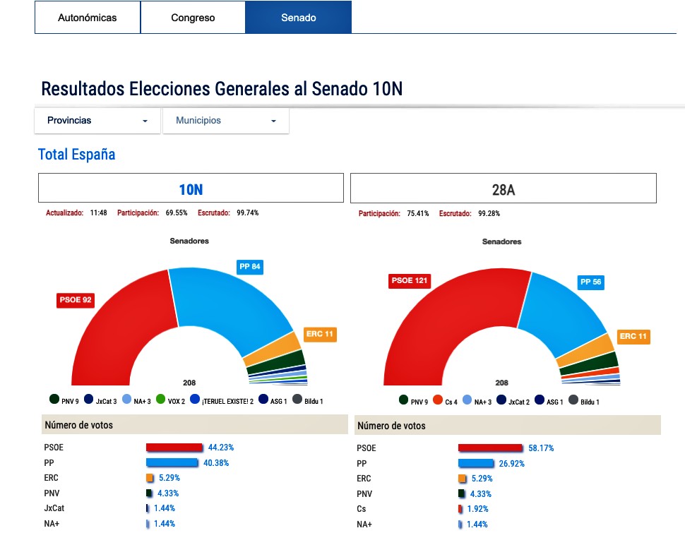 En el Senado, el PSOE sumaba 92 representantes frente a los 121 del mes de abril. El PP conseguía 84 sobre los 56 del 28ª.