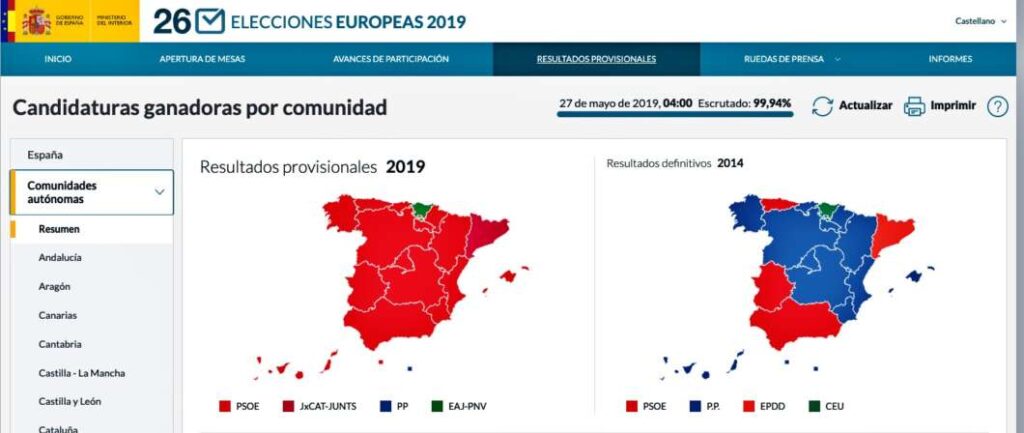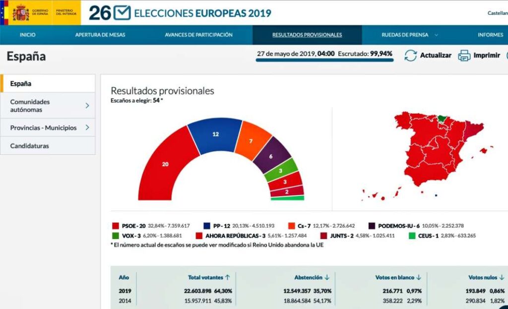 El 26 de mayo los españoles votaron para la elección de los diputados del Parlamento Europeo. Ejercieron su voto 22.603.898 personas (64,30%), con una participación mucho más alta a la de 2014 en la que apenas votó un 45,83% de la población).