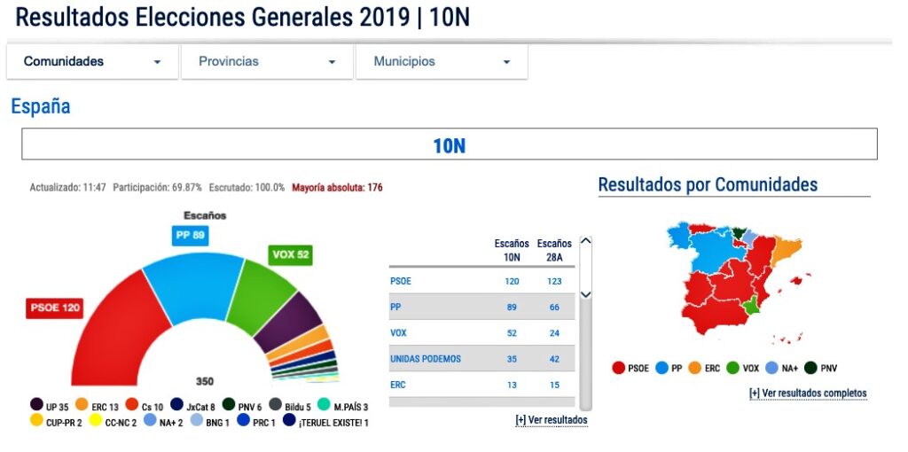 Pero además, VOX disparaba su número de votantes y se configuraba como la tercera fuerza política de España con 52 escaños, y relegaba a Podemos a la cuarta pero con tan solo 35 diputados, diez menos que el 28A. Compromís retrocedía en dos diputados y sumaba 13. Y Ciudadanos, que había firmado su sentencia de muerte al rechazar cualquier pacto posible con Pedro Sánchez, se desmontaba por completo y pasaba de 57 a 10 representantes.