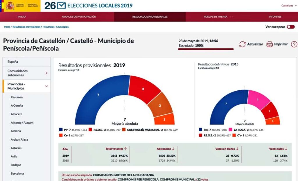 Peñíscola, 13 representantes a elegir. El PP de Andrés Martínez, revalidaba su mayoría absoluta.