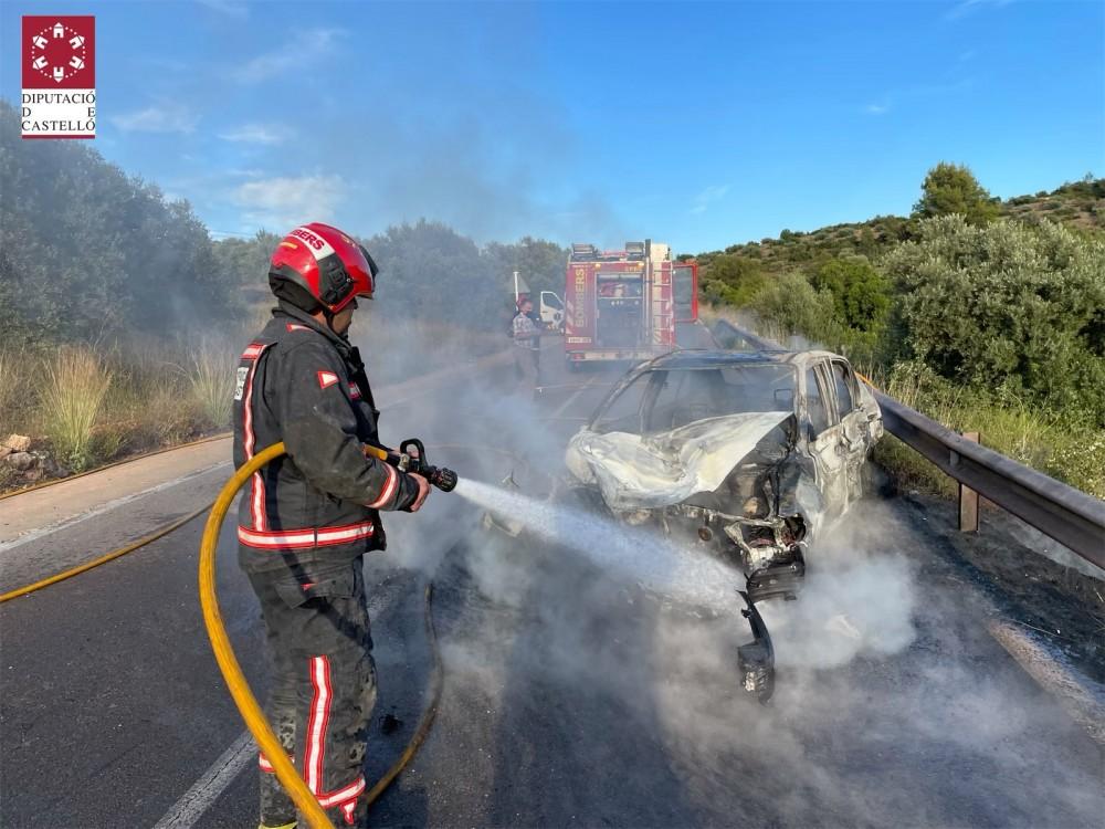 Dotaciones de bomberos de los parques de Plana Baixa y L’Alcalaten se han movilizado a accidente de tráfico con tres vehículos implicados, uno de ellos incendiado, en la CV190 a su paso por Figueroles. No ha habido atrapados pero sí ha resultado una persona herida que ha sido evacuada por medios sanitarios.