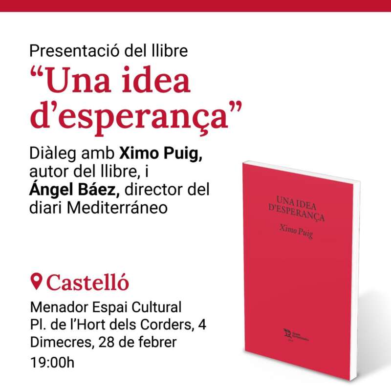 L'expresident de la Generalitat, Ximo Puig, presenta aquest dimecres 28 de febrer a Castelló el seu llibre "Una idea d'esperança" (Tirant Humanitats), una obra en la qual repassa els valors que han impregnat els seus huit anys al capdavant del Consell. Puig conversarà amb el director de El Periódico Mediteráneo, Ángel Báez, en el Menador Espai Cultural. L'acte serà a les 19 hores. L'entrada és lliure.