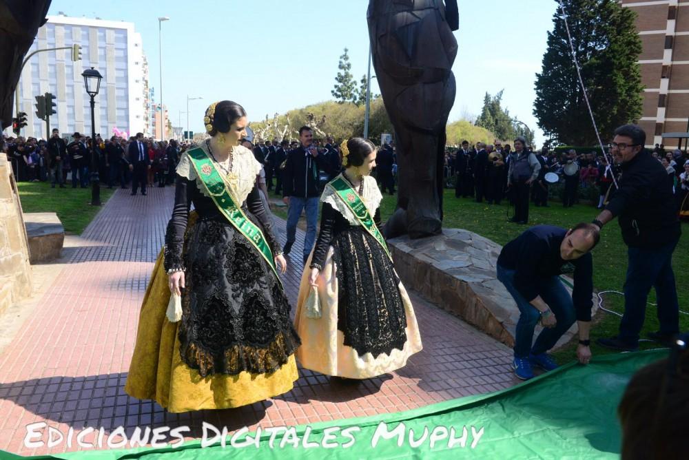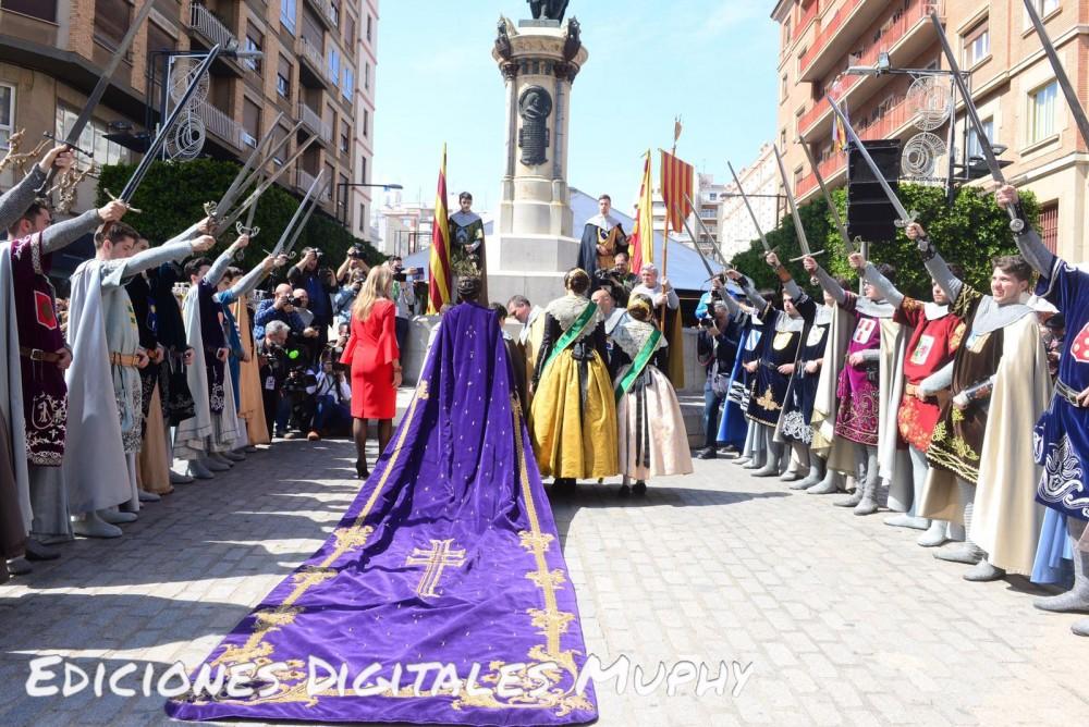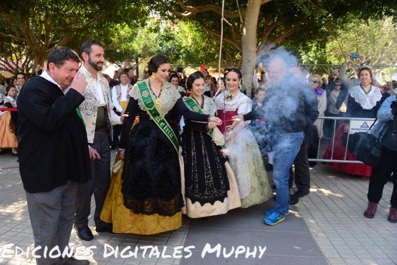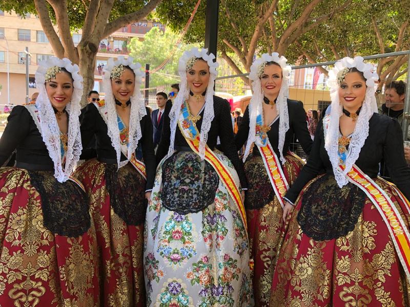 Las reinas de la Magdalena, Natalia Palacio y Natalia Collazos llegaban poco antes de las 12:00 horas, muy aplaudidas por el público y acompañadas por cortes de honor, madrinas, representaciones provinciales y la Junta de las Fogueras de Alicante, con sus Belleas del Foc al frente.