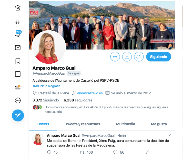 La alcaldesa de Castellón ha recibido directamente del presidente de la Generalitat la decisión de suspender o aplazar si se puede tanto las Fallas como las Fiestas de la Magdalena, e inmediatamente ha remitido un mensaje por Twitter para dar la noticia.