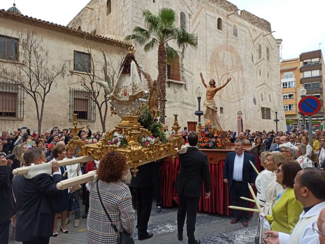 Desde la iglesia arciprestal salía la imagen de Jesucristo Resucitado, seguida de la cofradía del Santísimo y autoridades municipales y eclesiásticas, así como la banda de música de la Societat Musical La Alianza.