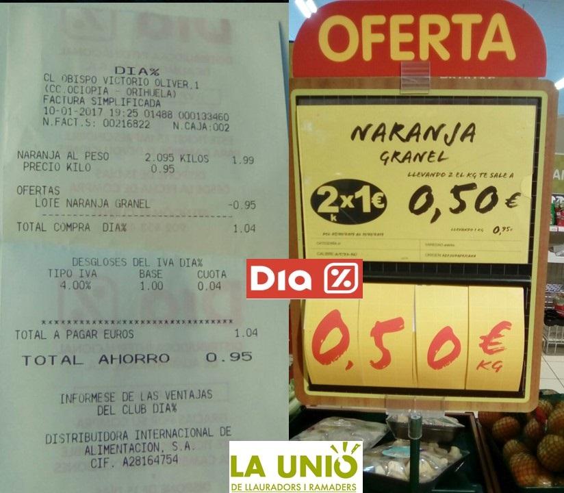La cadena de distribución Supermercados Dia realiza ahora ofertas 2x1 en naranjas sudafricanas de la variedad Navel (como se puede ver en la fotografía adjunta), por lo cual el kilo sale a 0,50 euros, aumentando todavía más la competencia sobre las nuestras y con una supuesta venta por bajo de los costes de producción y comercialización.