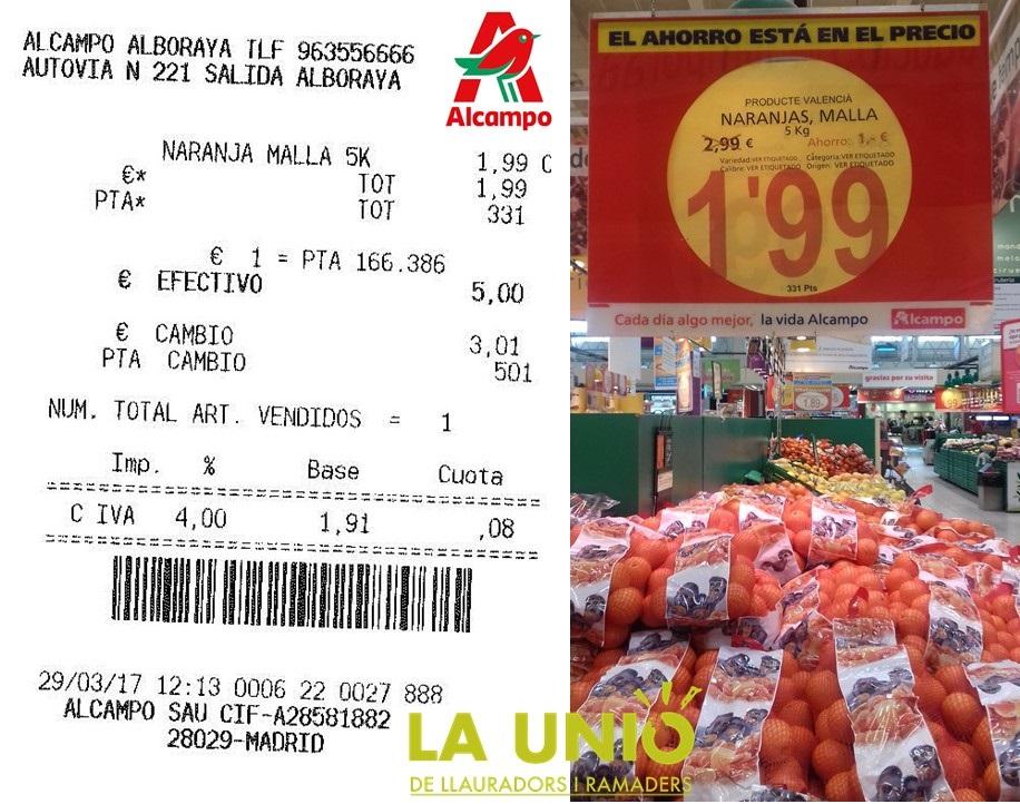 La cadena de distribución Alcampo tiene ahora mismo una oferta de una malla de 5 kilógramos de naranjas procedentes de la Comunitat Valenciana de la variedad Salustiana a 1,99 euros (como se puede ver en la fotografía adjunta, donde se tipografía como Producte Valencià), por lo cual el kilo no llega ni a la cantidad de 0,40 euros/kg. Inicialmente el precio original era de 2,99 euros los 5 kg, a 0,60 euros el kg. Esto supone una rebaja en el precio del 33,44%. Esta misma cadena de supermercados tiene a disposición de los consumidores otras naranjas también de la Comunitat Valenciana calificadas con la categoría Premium, cuya presencia en los lineales no cumple supuestamente con los requisitos legales respecto a la calidad de las mismas.