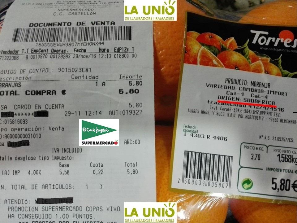 La gran distribución y algunos comercios continúan haciendo de las suyas en contra de los intereses de los citricultores de la Comunitat Valenciana. La Unió de Llauradors ha podido comprobar como en el centro comercial de El Corte Inglés de Castellón todavía se venden cítricos de Sudáfrica, en este caso naranja (tal y como se puede observar en la fotografía), cuando los productores valencianos están teniendo una campaña catastrófica agravada por la climatología adversa de los últimos días.