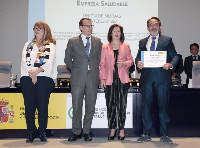 El Ministerio de Empleo ha entregado a Unión de Mutuas el premio 'Empresa Saludable' en la categoría de Buenas Prácticas de Promoción de la Salud en el Trabajo, durante el acto de celebración del III Encuentro de la Red Española de Empresas Saludables, que organiza anualmente el Instituto Nacional de Seguridad e Higiene en el Trabajo (INSSBT), y que se ha celebrado en Madrid.