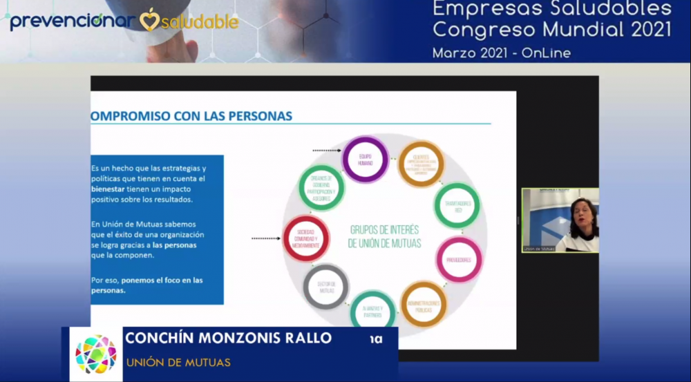 Conchín Monzonís, Coordinadora de la Comisión de Empresa Saludable de Unión de Mutuas, en su ponencia “El compromiso con las personas a través de una organización saludable” ha presentándolos proyectos puestos en marcha por la entidad; tanto los resultados de los proyectos cerrados en 2020 como los planificados para el periodo 2020-23, enfocados a la promoción de la salud y bienestar psicológico así como el plan de sensibilización y prevención del Covid-19 implementado a raíz de la pandemia.