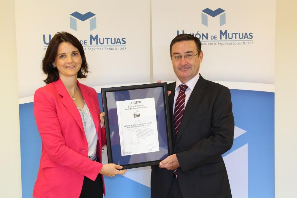 La entrega del certificado IQNET SR10 ha tenido lugar hoy en la sede de Unión de Mutuas, en Castellón, donde el director de AENOR en la Comunitat Valenciana, Salvador Ibáñez, ha entregado dicho certificado a la directora adjunta de la entidad, Teresa Blasco, quien ha destacado la trayectoria de la mutua con el enfoque ético de la responsabilidad social, la buena gestión económica, social y medioambiental, la seguridad del paciente, la Empresa Saludable, el Esquema Nacional de Seguridad, la seguridad de la información y la prevención de delitos y compliance penal.