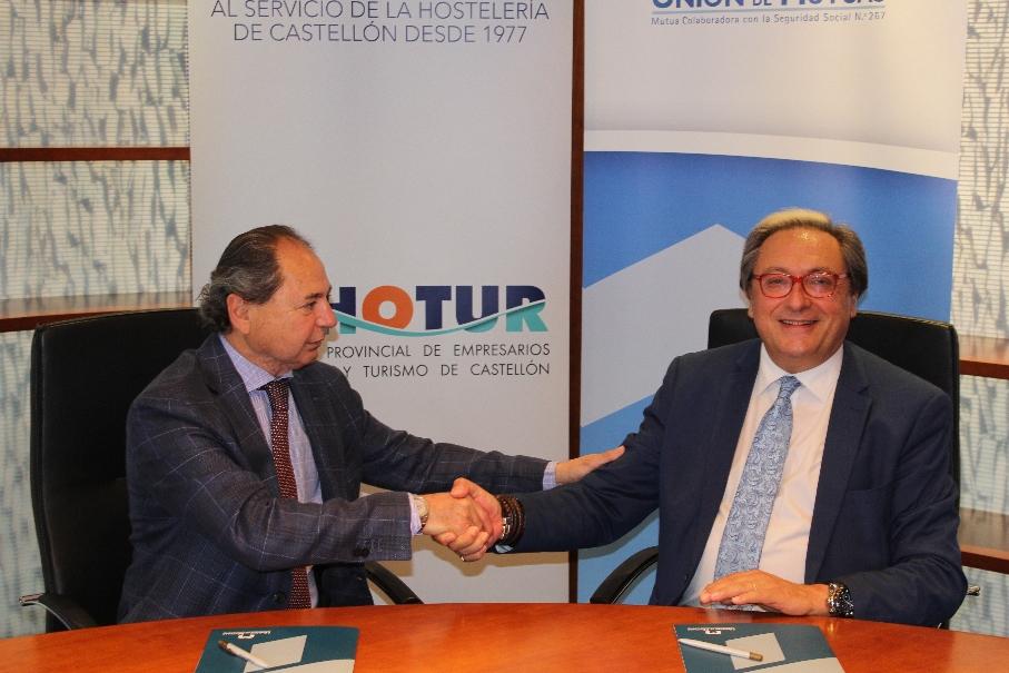 Unión de Mutuas y la Asociación de Empresarios de Hostelería y Turismo de la provincia de Castellón, ASHOTUR, han firmado un convenio de colaboración en materia laboral y de seguridad social al objeto de reforzar las relaciones entre ambas entidades y ofrecer un mejor servicio a sus empresas asociadas, trabajadores protegidos y autónomos adheridos.