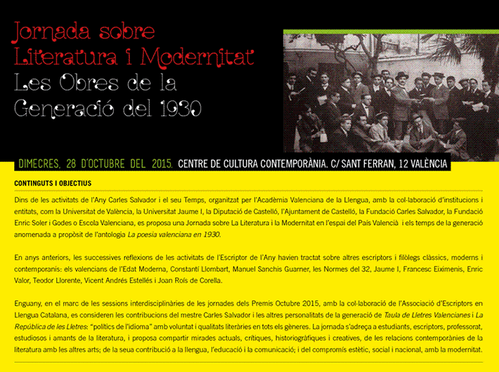 La Academia Valenciana de la Llengua -AVL- ha organizado para mañana día 28 en Valencia una jornada dedicada a la 'Literatura y la Modernidad, las obras de la generación de 1930'. La misma se enmarca dentro del año dedicado a 'Carles Salvador i El Seu Temps'. Salvador, también conocido como El Mestre de Benassal es el 'Escriptor de l'Any' nombrado por la AVL. La actividad se desarrollará en el Centre Octubre de Cultura Contemporánea.