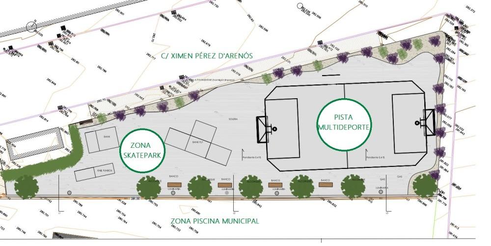 Se trata de una zona deportiva de unos 1.000 metros cuadrados, en el solar dotacional que existe ahora sin uso junto a la piscina municipal. En ella se construirá una pista multideportiva de 10x21 metros para practicar fútbol sala, baloncesto, balonmano… combinando el espacio con bancos y zonas verdes. El recinto se completará con un área para practicar skate, que estará dotada con tres módulos y diversos tipos de rampas para todo tipo de patines y patinetes.