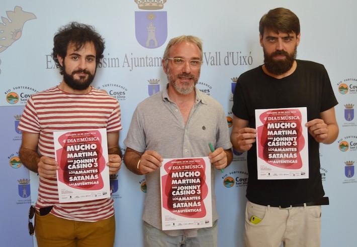 La Vall d'Uixó celebrará el sábado 18 de junio el IV Día de la Música, que empezará a las 11.00 horas con una feria musical y actividades infantiles. El concejal de Cultura, David Lluch, y los representantes de la asociación Cultura Mutant Eduard Muñoz y Javier Peñarroja han presentado este evento que se desarrollará junto al Mercado Municipal. La programación está conformada por un total de cinco actuaciones musicales y actividades para los más pequeños.