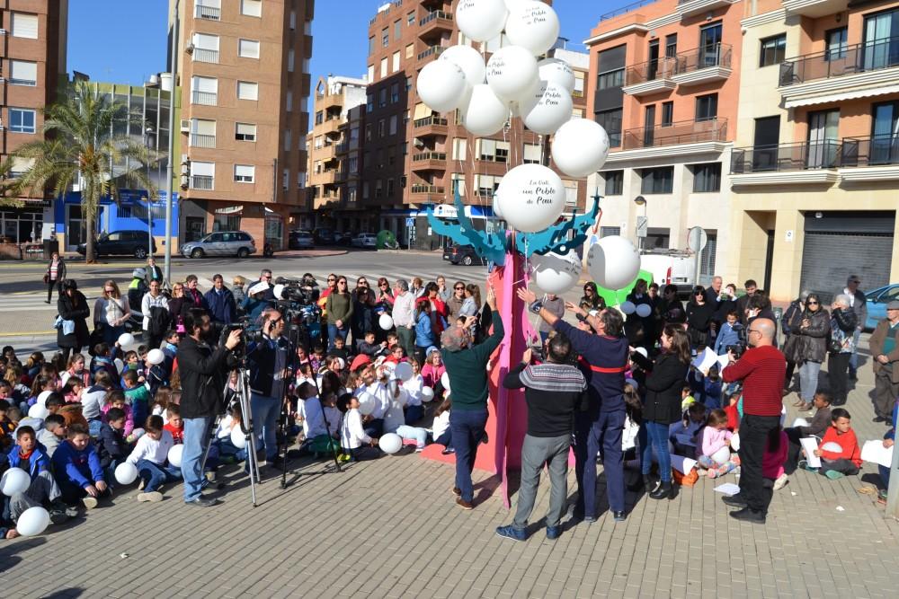 Su frase "Nosotros los pacifistas somos los realistas" ha presidido el acto, en el cual se han colgado globos del árbol de la paz de la plaza Mahatma Gandhi (junto a la estación de autobuses), los 12 colegios públicos han leído un manifiesto por la paz y se han lanzado palomos. Además, Javier Penyarroja y el Coro Infantil Municipal han cantado una versión de la canción 'Blowin' in the wind' de Bob Dylan.