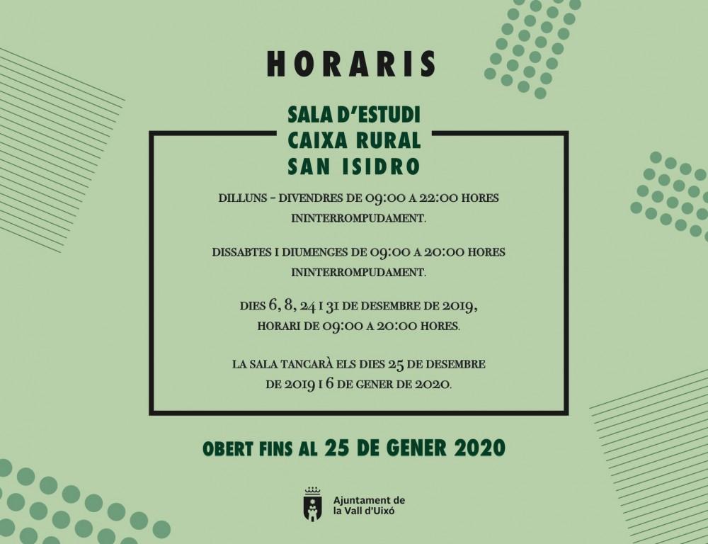 Cruces, además, también ha dado a conocer los horarios de la Biblioteca de la Caixa Rural San Isidro: de lunes a viernes de 09.00 a 22.00 horas, ininterrumpidamente; y sábados y domingos de 09.00 a 20.00 horas, también ininterrumpidamente. Los días 6, 8, 24 y 31 de diciembre, el horario será de 09.00 a 20.00 horas, y los días 25 de diciembre, 1 y 6 de enero la biblioteca permanecerá cerrada. Estos horarios estarán en vigor hasta el 25 de enero, a causa de la gran demanda de los estudiantes universitarios en época de exámenes. Por otro lado, la Biblioteca Pública Mª Dolores Garcia seguirá con su horario habitual.