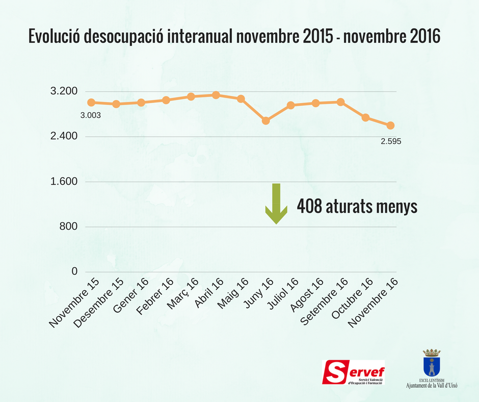 El concejal de Empleo del Ayuntamiento de la Vall d'Uixó, Jorge García, ha dado a conocer los datos interanuales de desempleo de la ciudad y de noviembre de 2015 a noviembre de 2016 (último mes del que se tienen datos) el número de desempleados se ha reducido en 408 personas. En concreto, de 3.003 a 2.595.