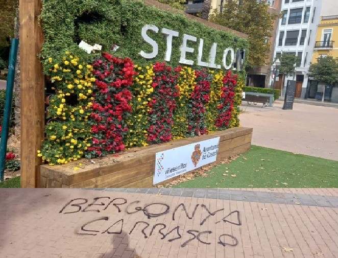 El letrero de ‘Castellón’ vuelve a protagonizar otro acto de gamberrismo y aparece una pintada en el suelo con el texto ‘Bergonya Carrasco’