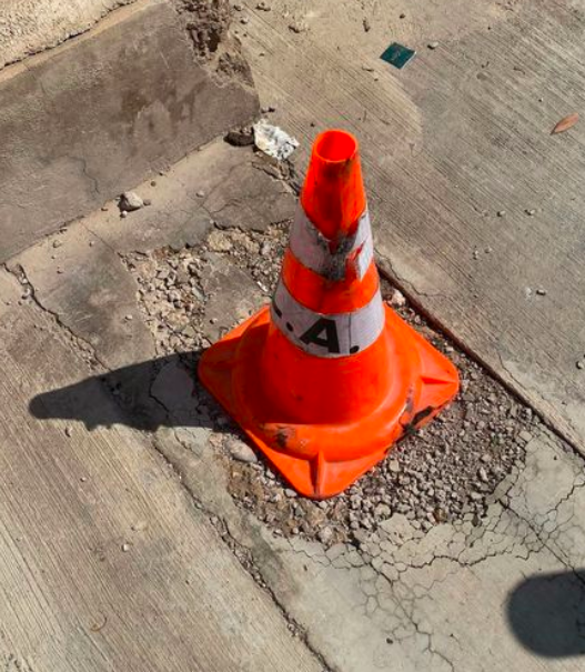 Lamentan el robo de un cono que señalaba un desperfecto en la calle Om Blanc que puede provocar hundimientos